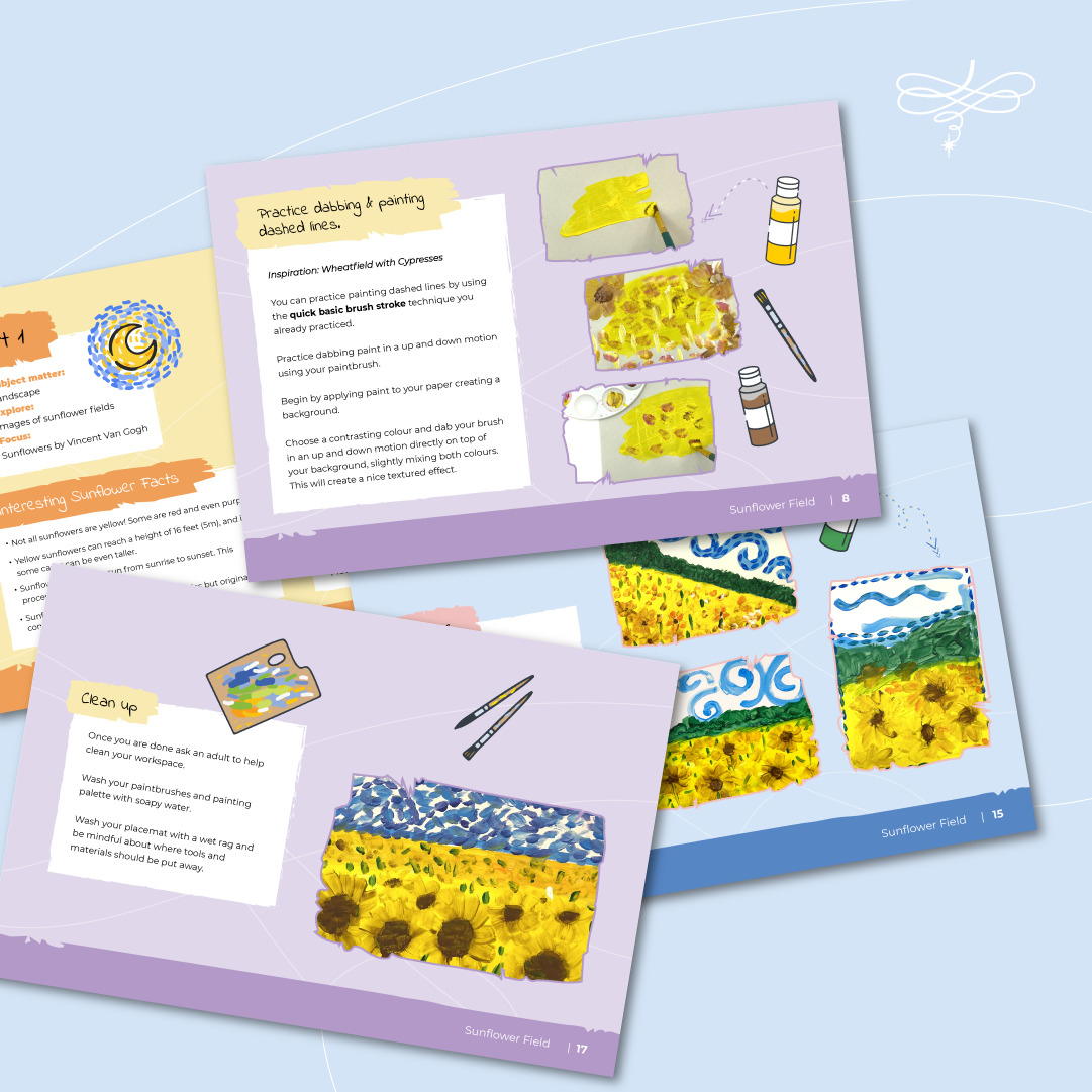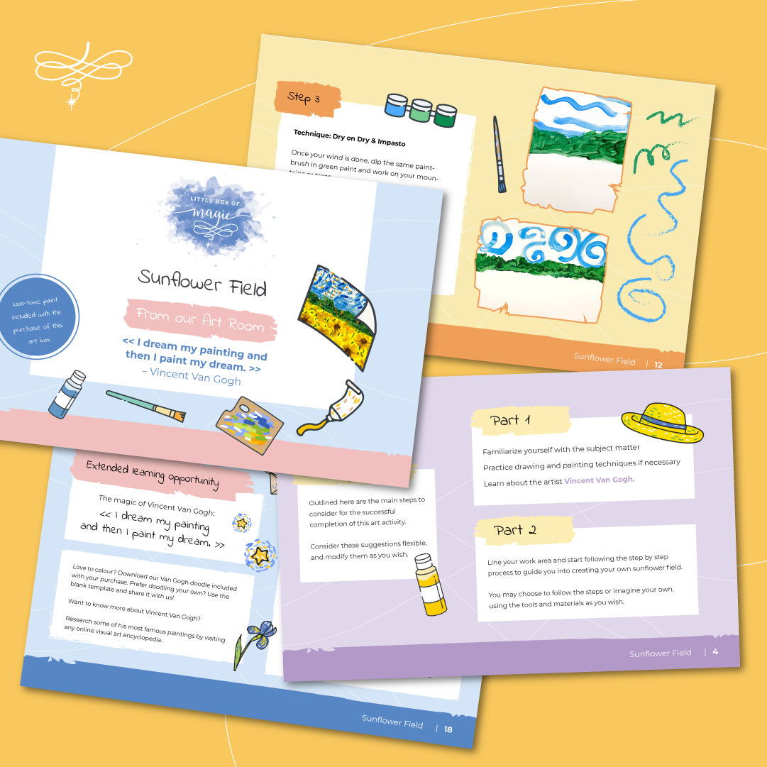 Donnez libre cours à l’artiste qui sommeille en vos enfants ! Dans le cadre de cette activité ils apprendront différentes techniques de peinture pour réaliser une superbe œuvre d’un champ de tournesols à la manière de Vincent Van Gogh. Dites adieu au stress lié à la recherche de fourniture d’art! Cette trousse comprend tout ce dont vos enfants auront besoin, du matériel de haute qualité aux instructions facile à suivre, afin que vous puissiez vous concentrer sur ce qui compte le plus : laisser libre cours à leur créativité. Cette trousse est conçue pour aider à améliorer leurs compétences en matière d’organisation et de planification tout en créant des œuvres d’art inspirées de la nature. Soyez coloré et amusez-vous.
