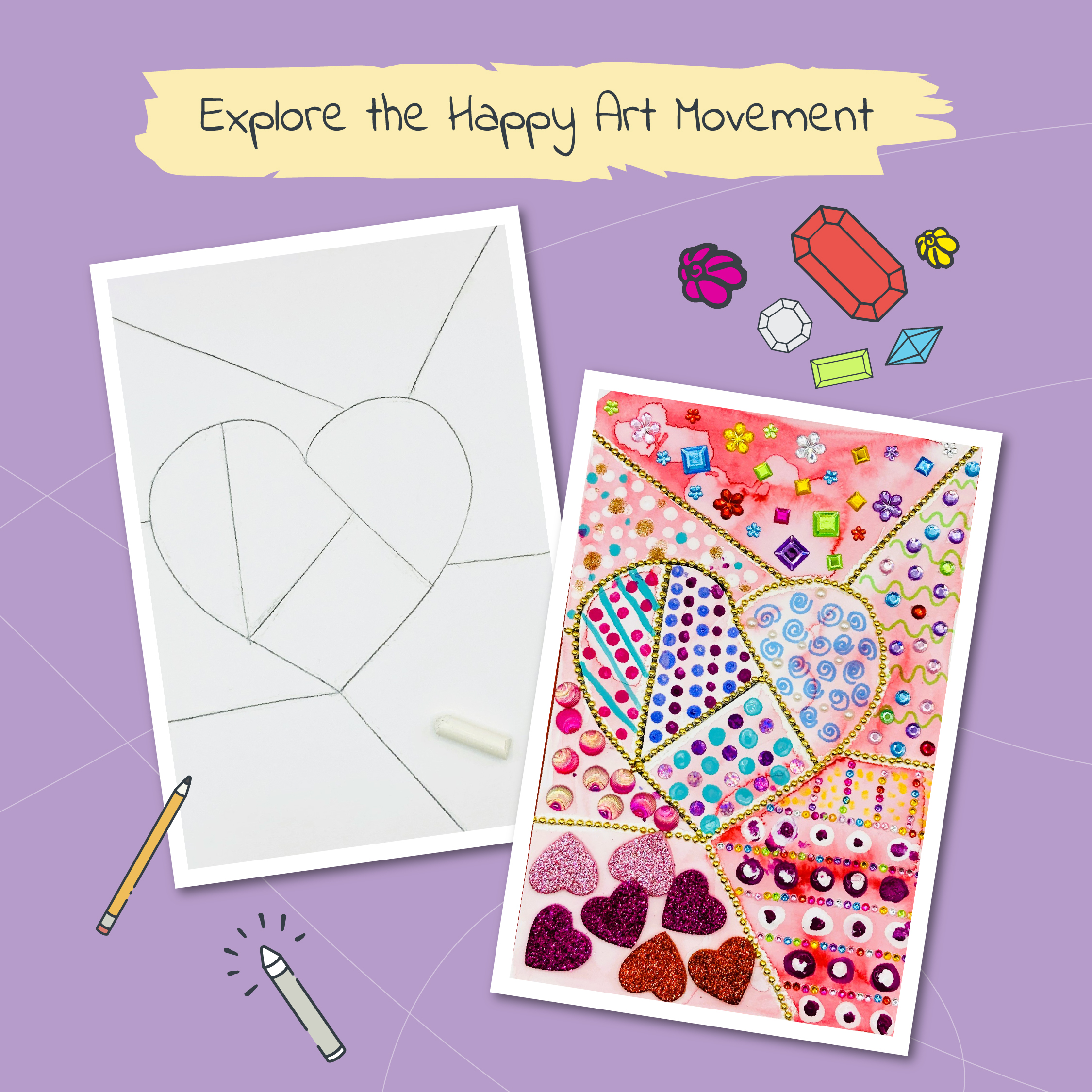 Let the artist in your children shine! Let them be colourful with self-adhesive gemstones, stickers, watercolour paint and Sharpies to create a Happy Heart inspired by Romero Britto’s unique Pop Art style! They will learn about the Happy Art Movement, learn to create bold geometric designs, explore vibrant colour combinations and master Britto’s signature thick black outlines and playful patterns.Â