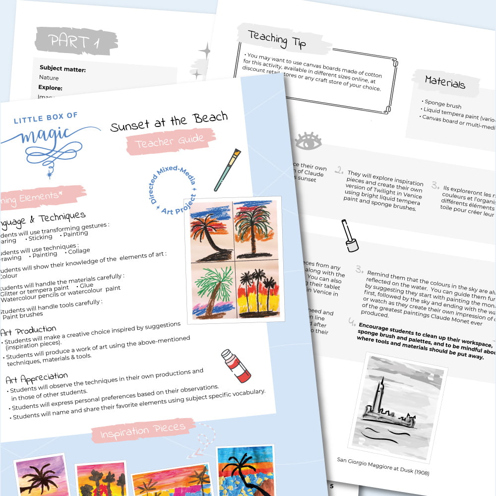 Your purchase will include one PDF of the instructions (25 pages), one PDF of our Monet Factsheet and Doodle Notes (3 pages), one PDF of our Monet Doodle (2 pages) and one PDF of our Beach Template (1 page).